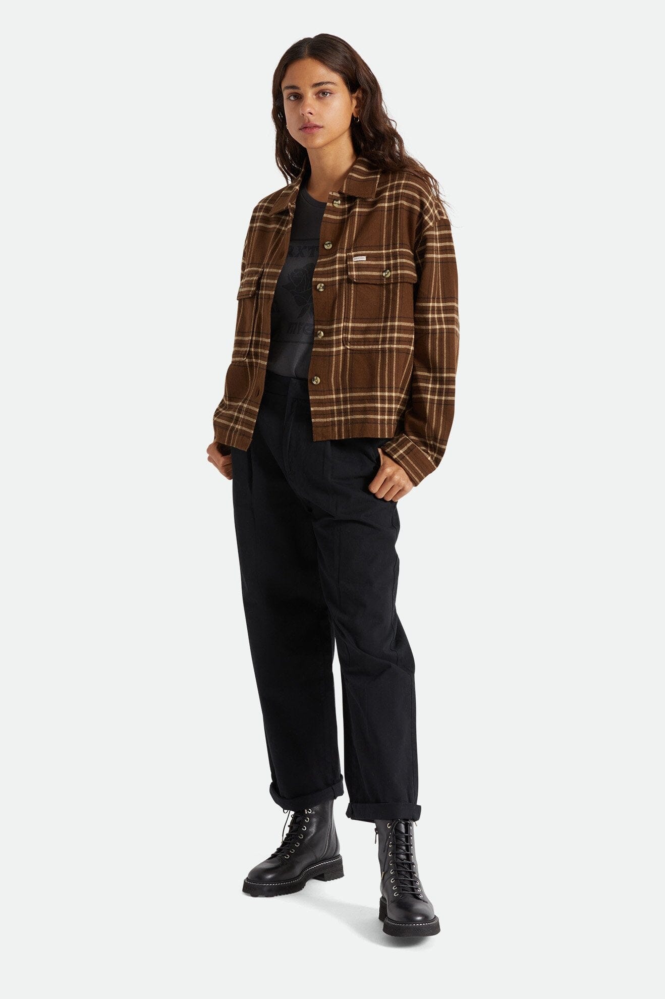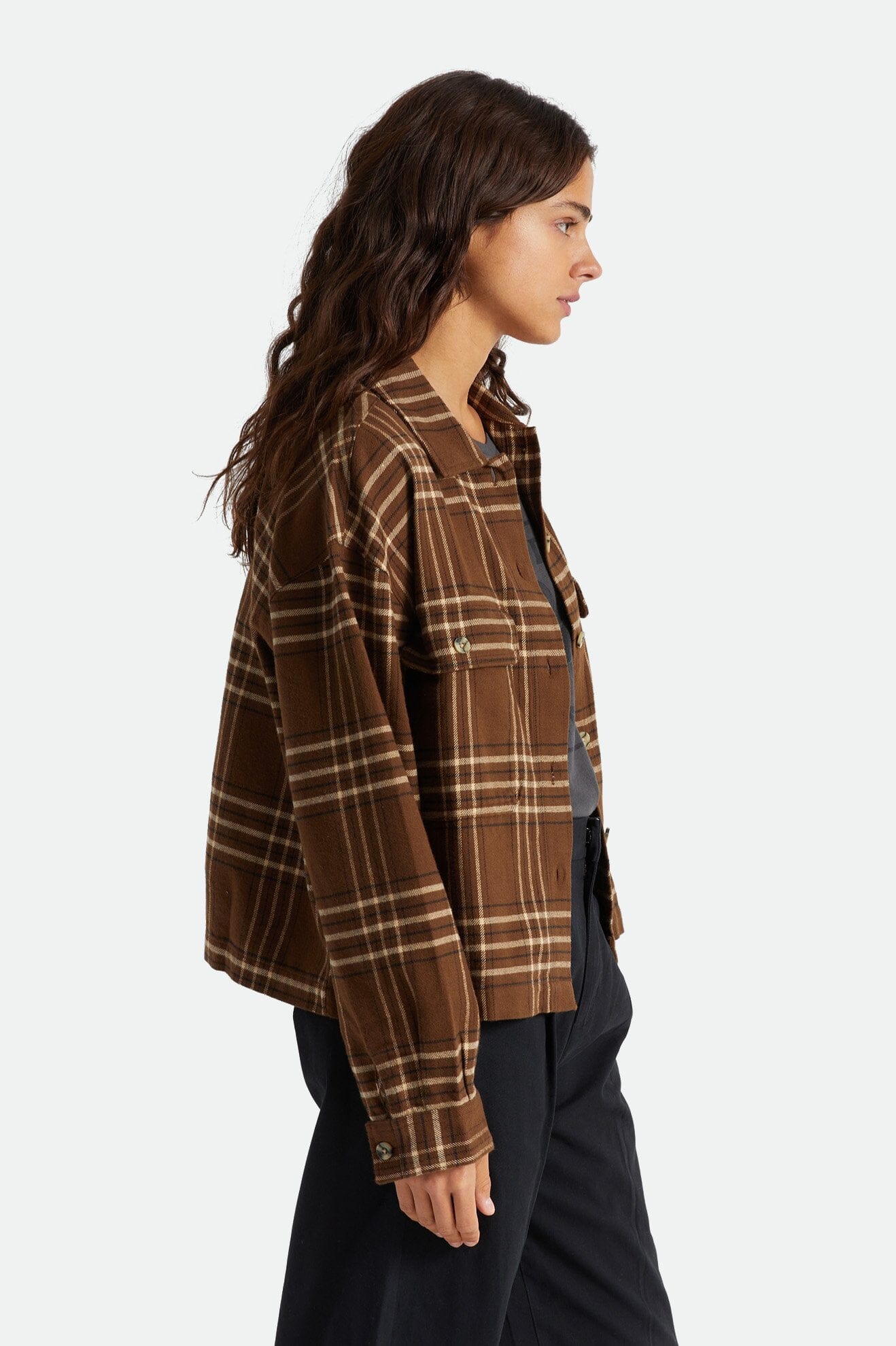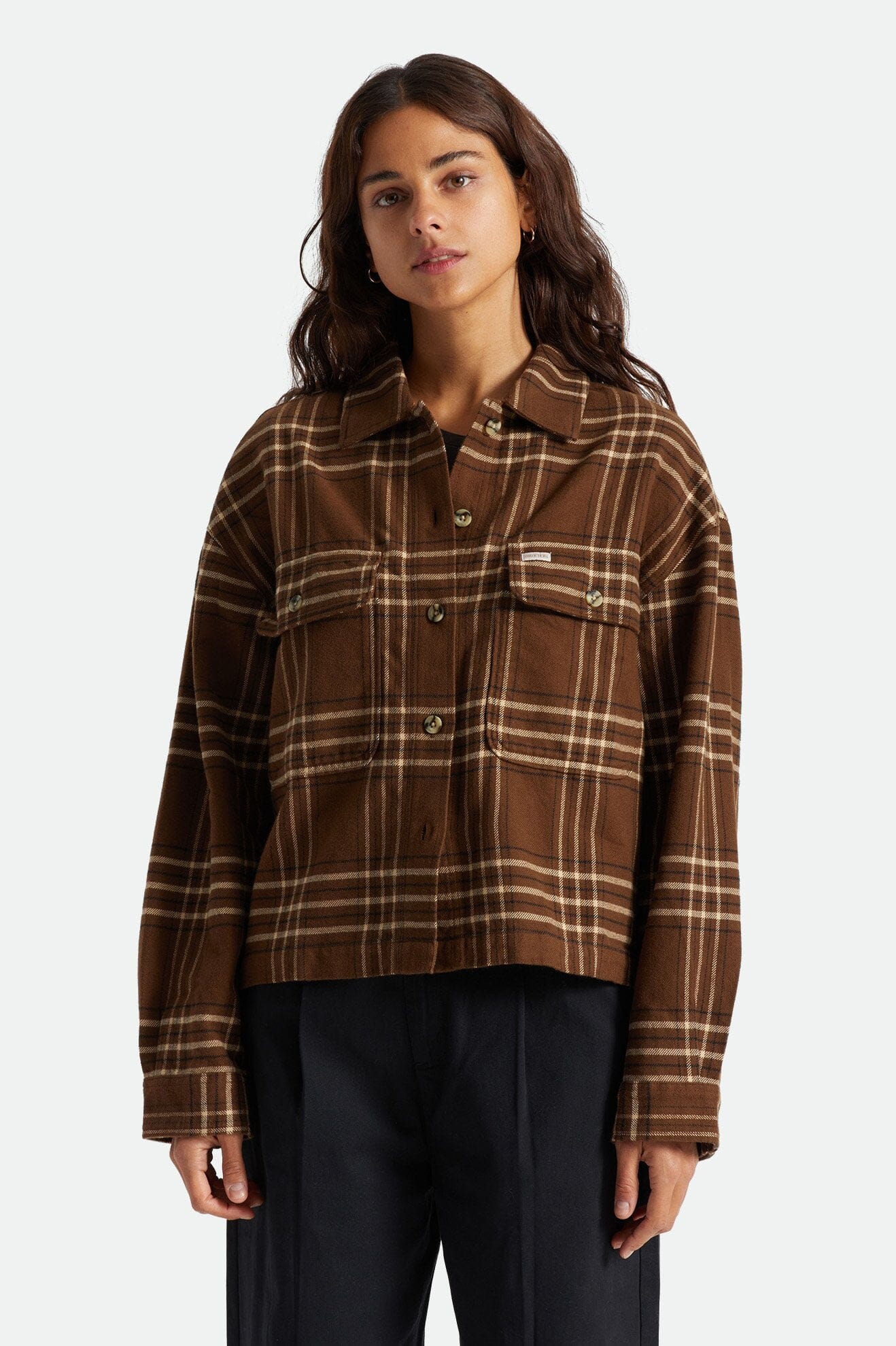 Tidløs flanellskjorte til dame, med lett oversized passform, rette kanter og kortere lengde.