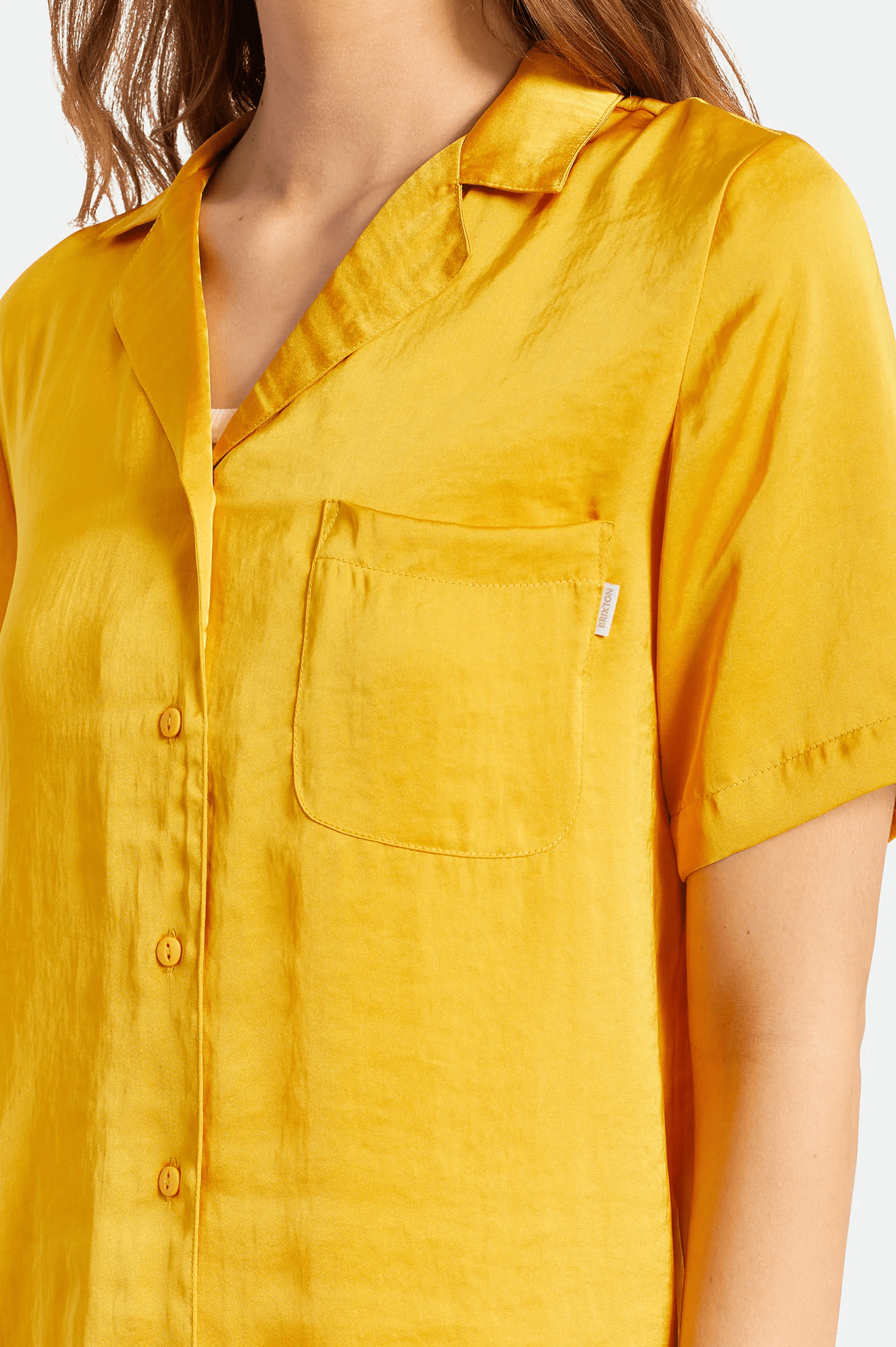 Den kortermede skjorta har løs og ledig boyfriend-stil, knapper i front og brystlomme. Materialet i polyester sating gir en avslappet passform og uavstrengt stil.