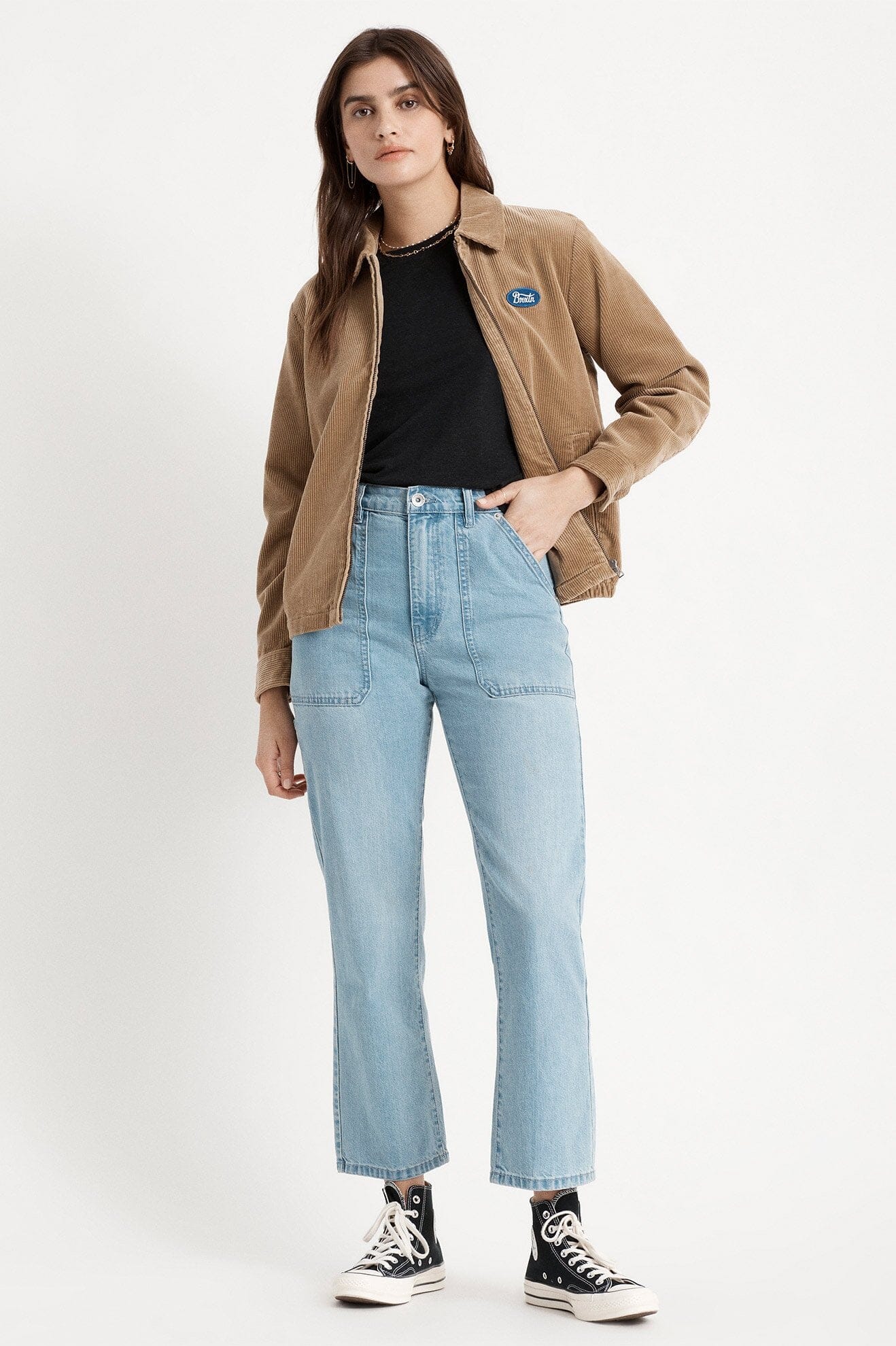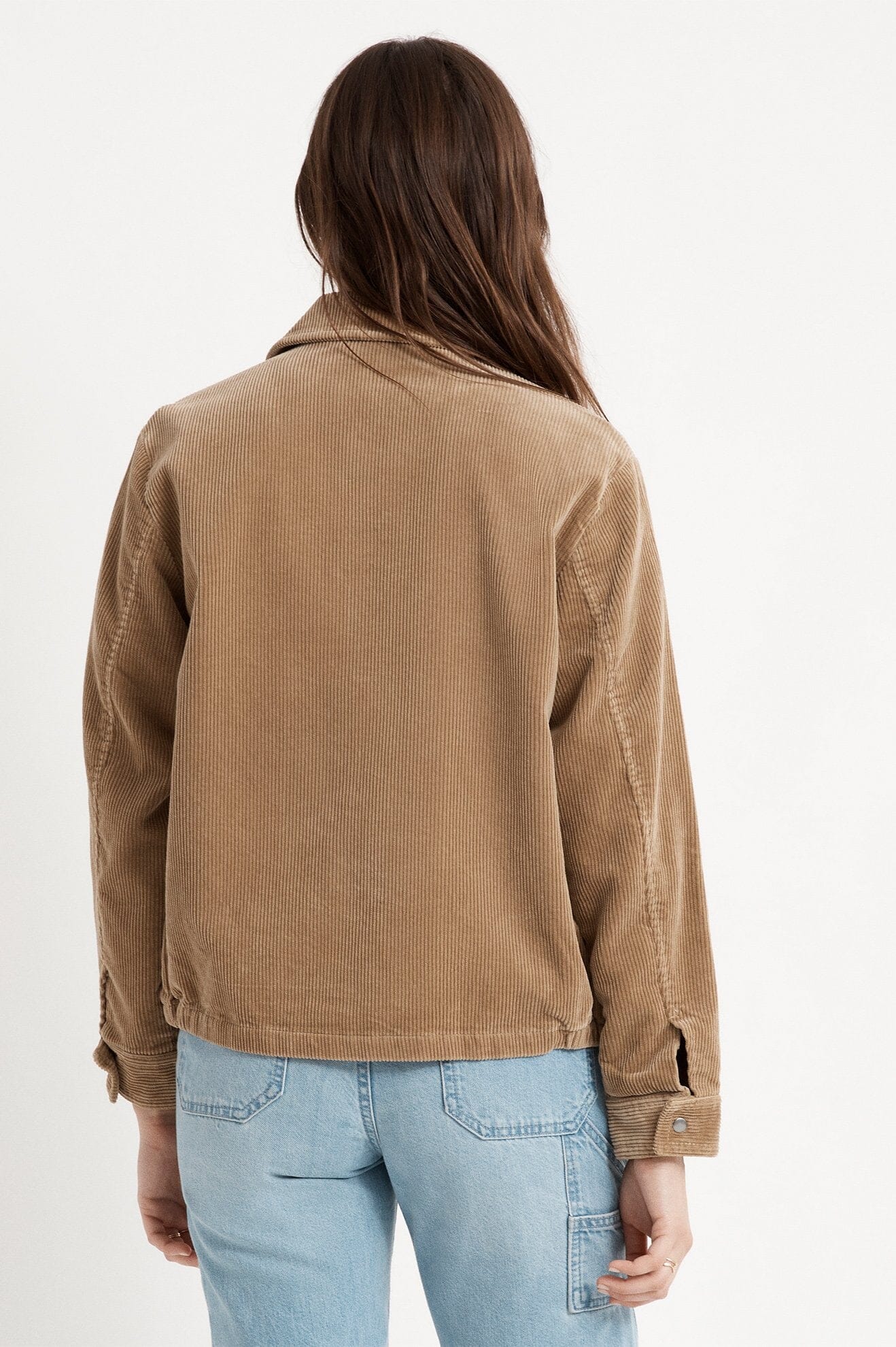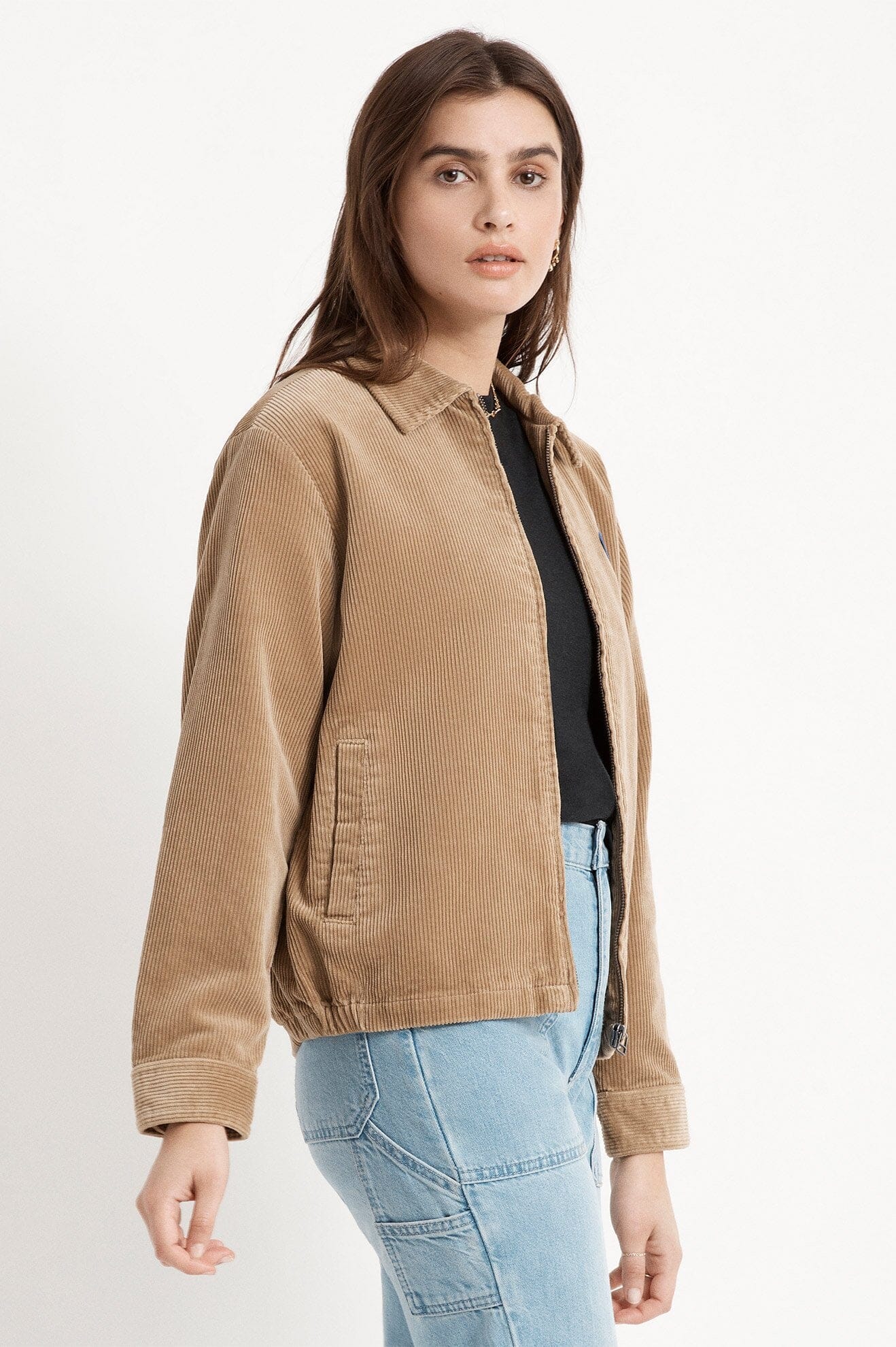 Tidløs og stilren ytterjakke til dame i work wear-stil. Jakka har praktiske sidelommer, krage, skjult glidelås i front, lett elastikk i siden og brede mansjetter i ermene med knapper.