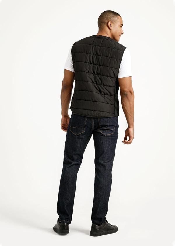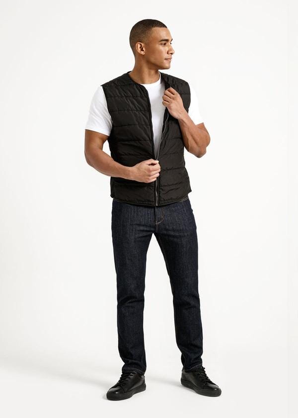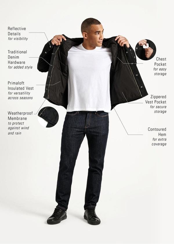 Vind- og vannavvisende denimjakke fra DUER, med isolert vest på innsiden som kan brukes separat.