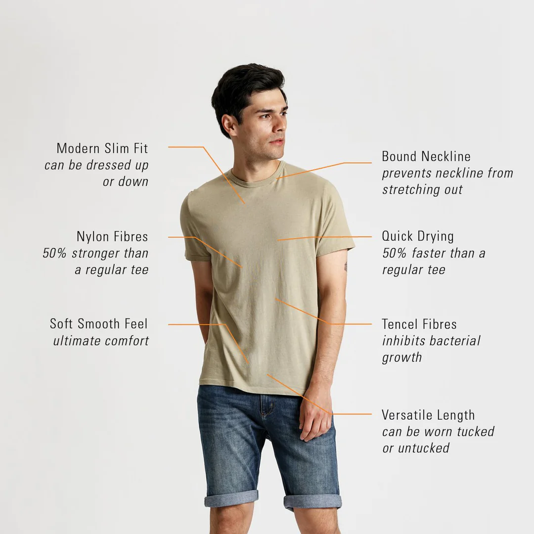 T-skjorta har en moderne og rett passform som gjør at den kan brukes til alt. Allsidig lengde for bruk enten utenfor, eller nedi buksa. Ekstra behagelig materiale som er anti-bakterielt og tørker 50 prosent raskere.