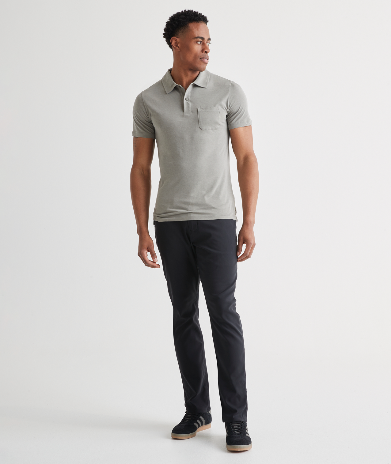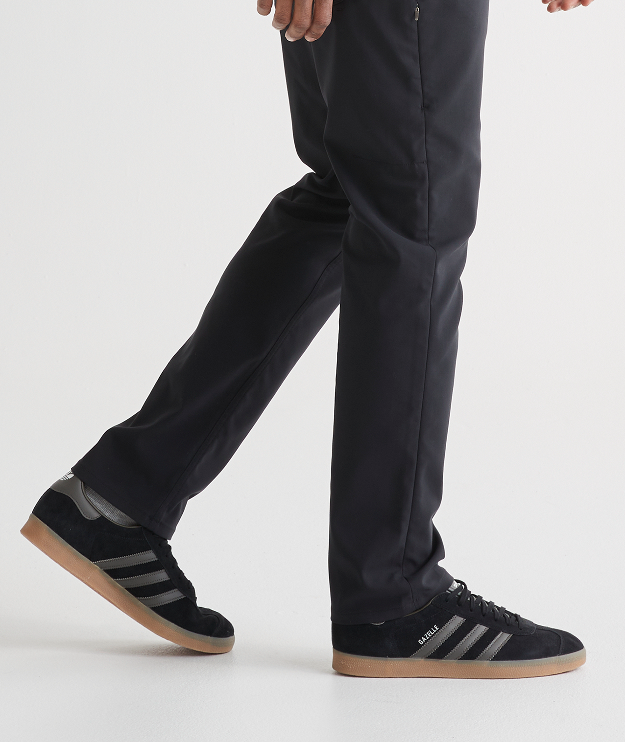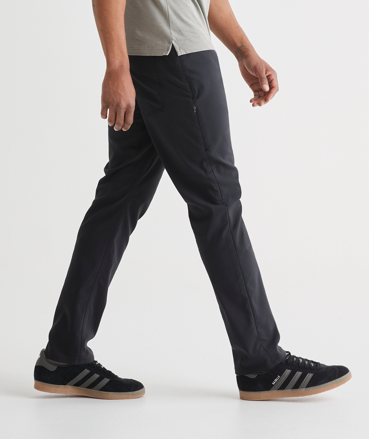 DUER NuStretch Slim 5-pocket har slank fit over hofte og lår, med smalere passform ved anklene.
