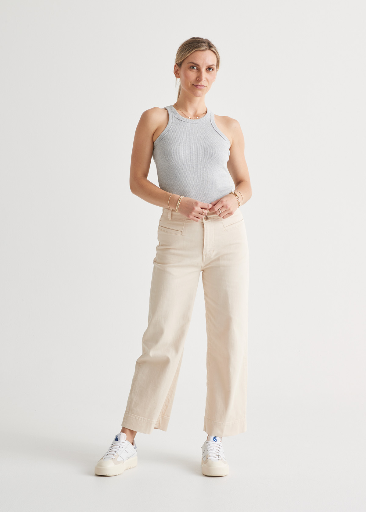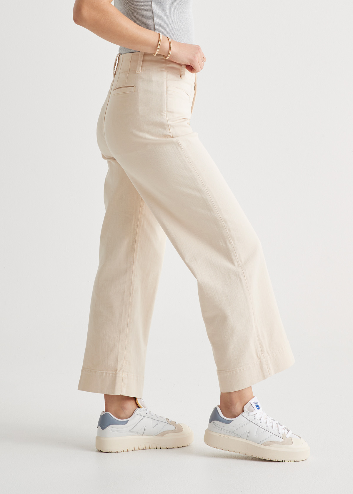 Allsidig og behagelig fritidsbukse til dame i lux twill med økologisk bomull. Denne type stoffvev gir en klassisk og elegant finish og vil mykne ved bruk uten å miste formen.