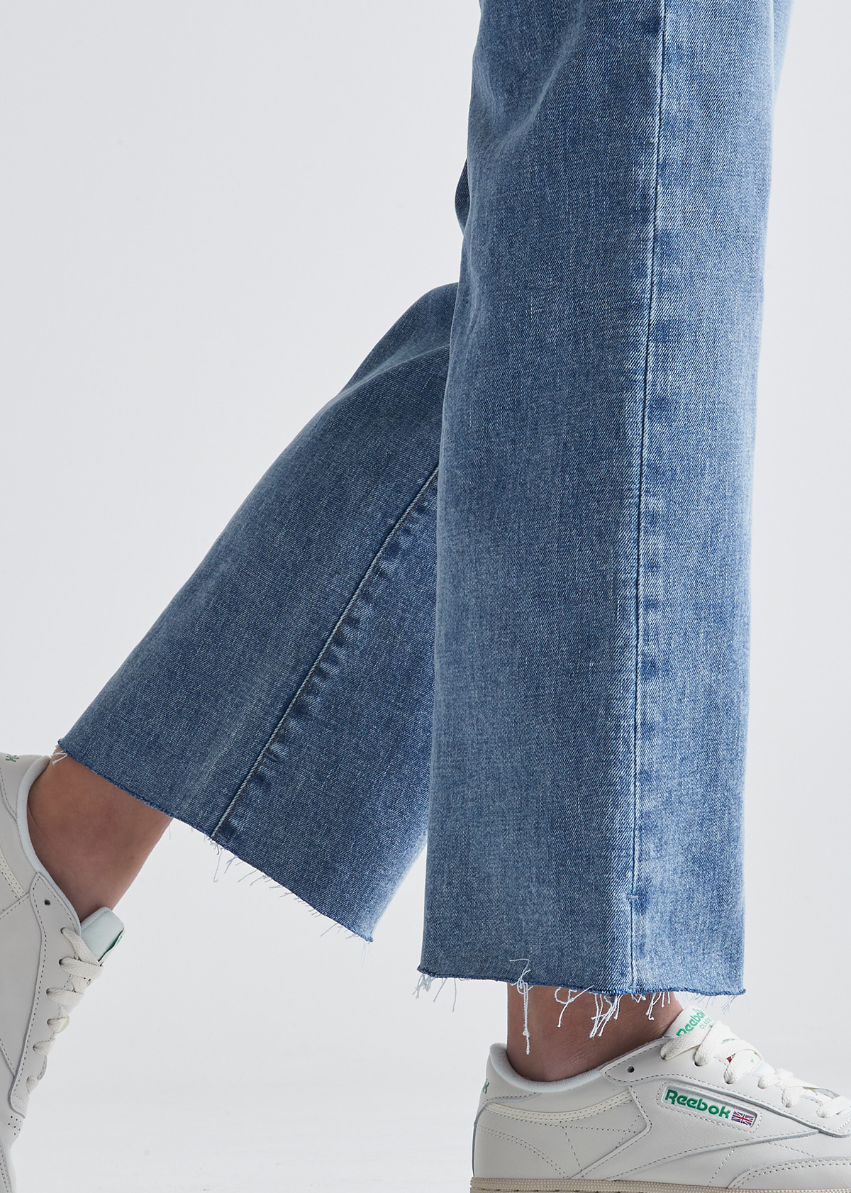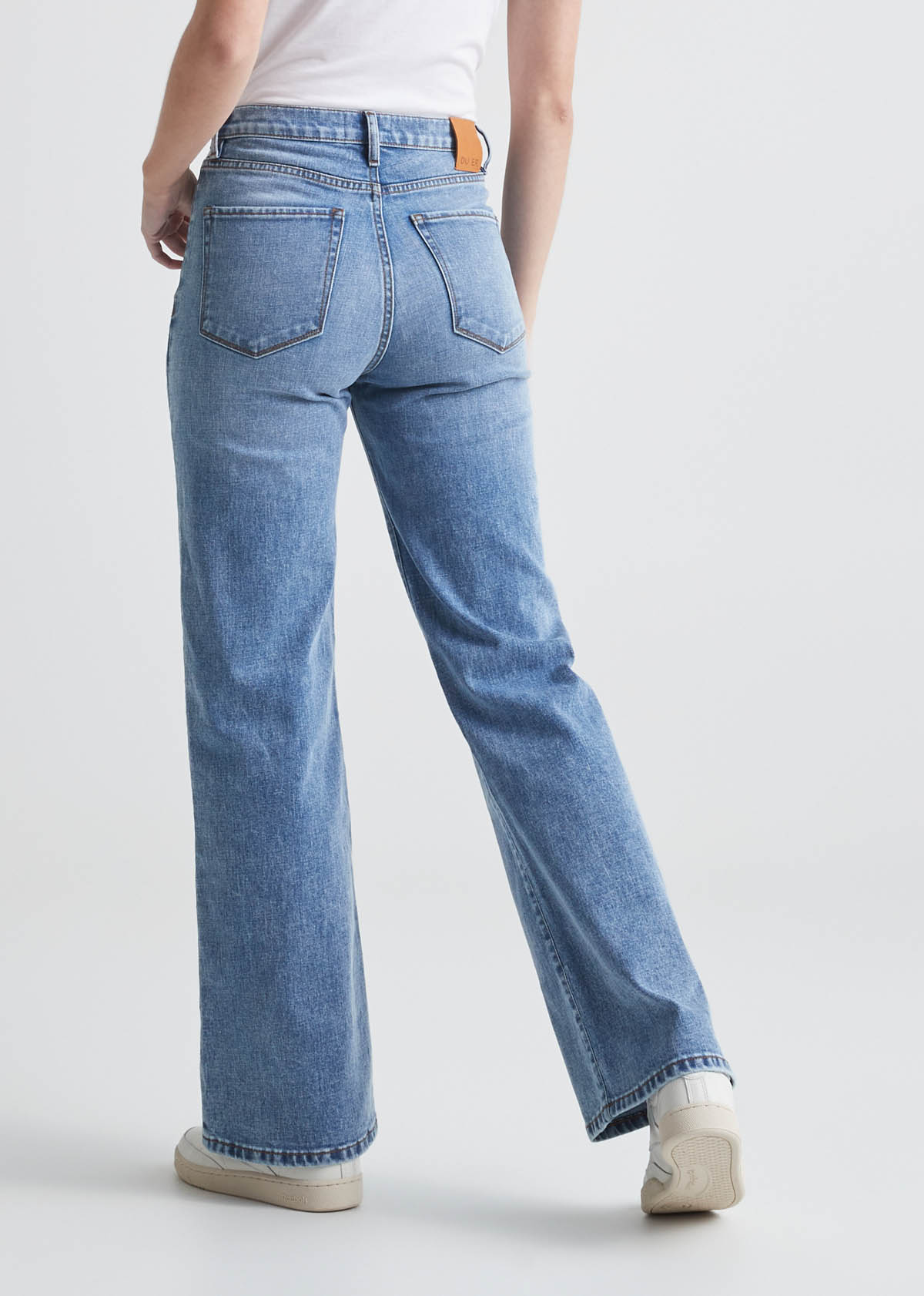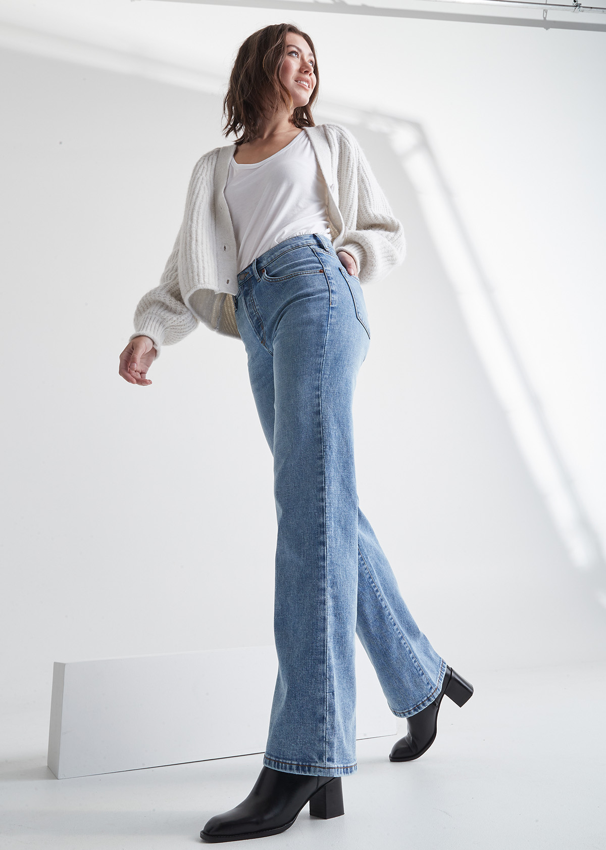 Jeansen har middels høyt liv, flatterende fit over hofte og lår og wide leg åpning. Praktiske lommer, glidelås og knapp i åpning