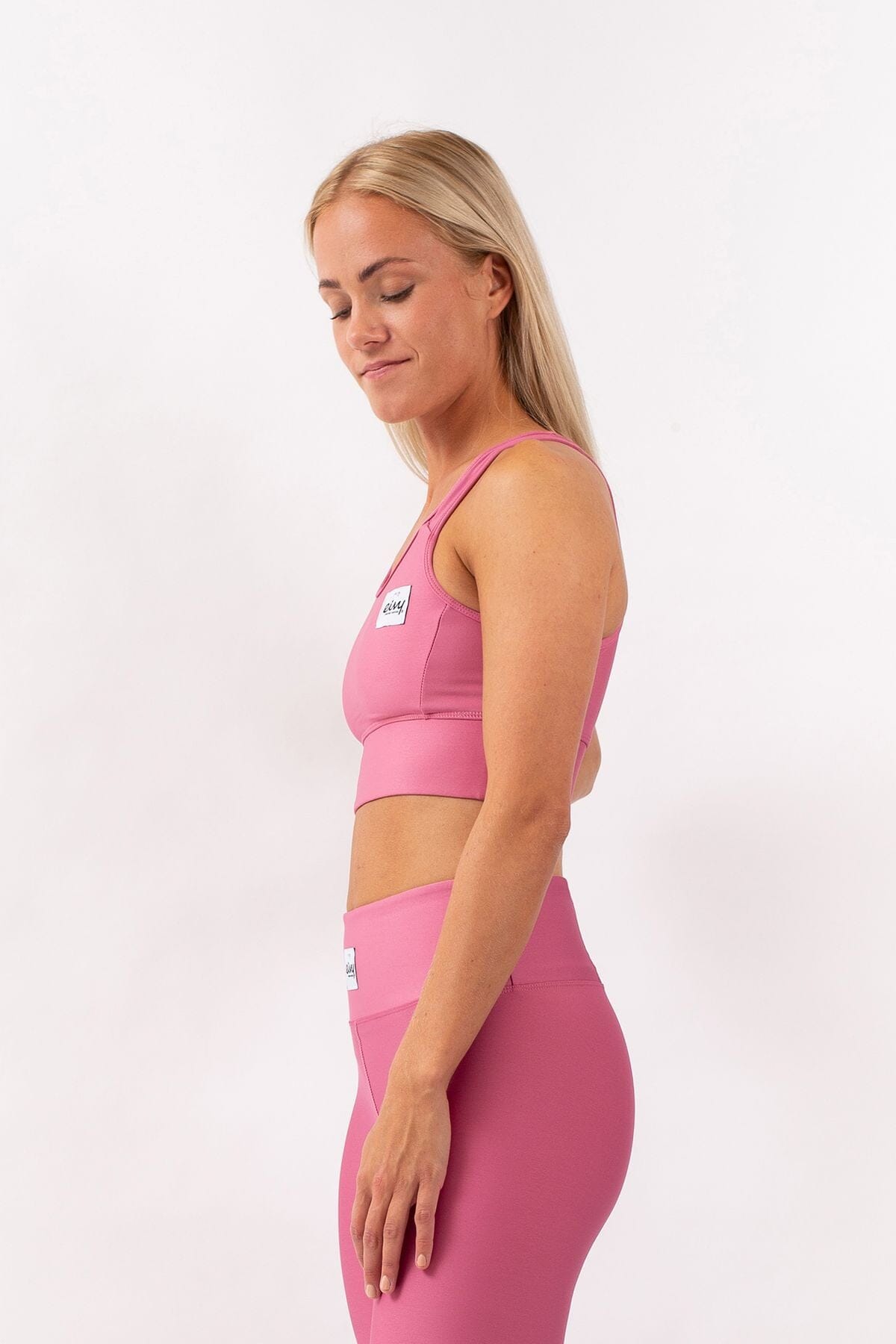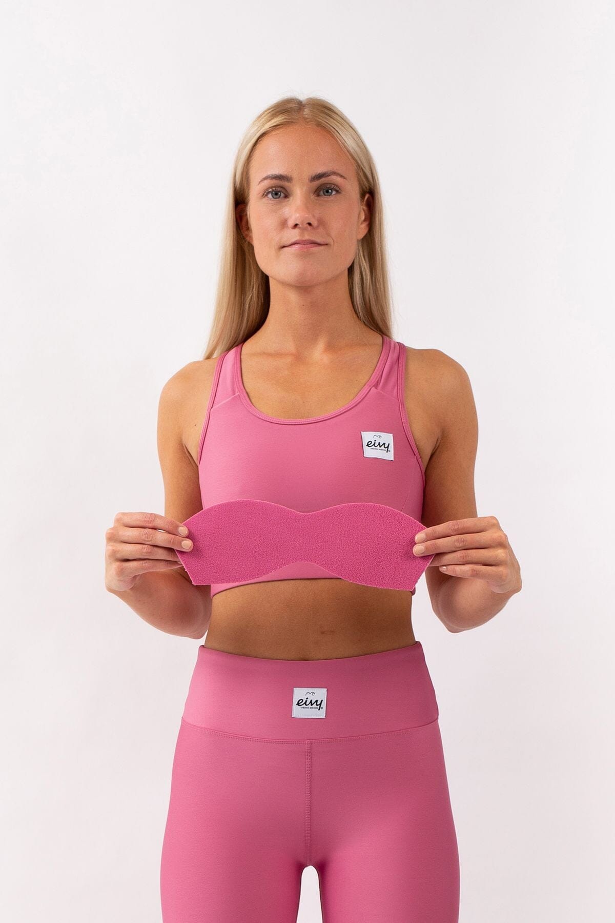 Sports-bh i hurtigtørkende og fuktabsorberende stoff med elastikk i midjen. Polstring i fleece som kan tas ut, samt integrert lomme i rygg. Behagelig å ha på, passer til aktiviteter som krever middels støtte.