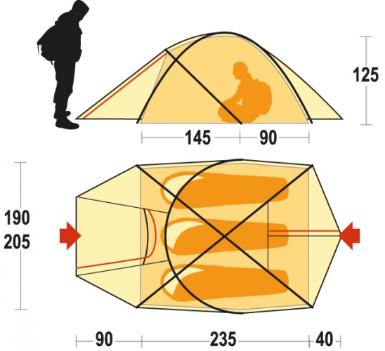- Entrance and ventilation: Front vestibule that rolls up fully, Rear vestibule, Room door with mosquito net exterior that opens out fully and folds into a special pocket, Ventilation sleeves can be closed from the inside