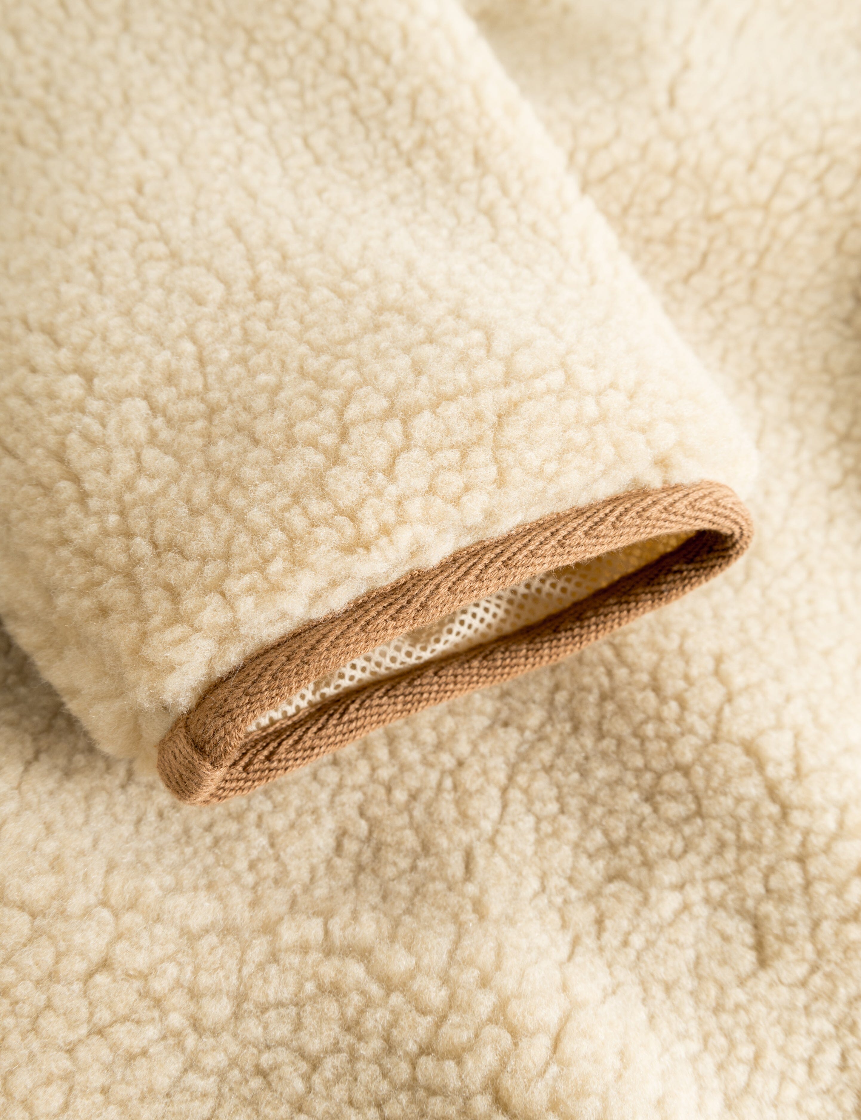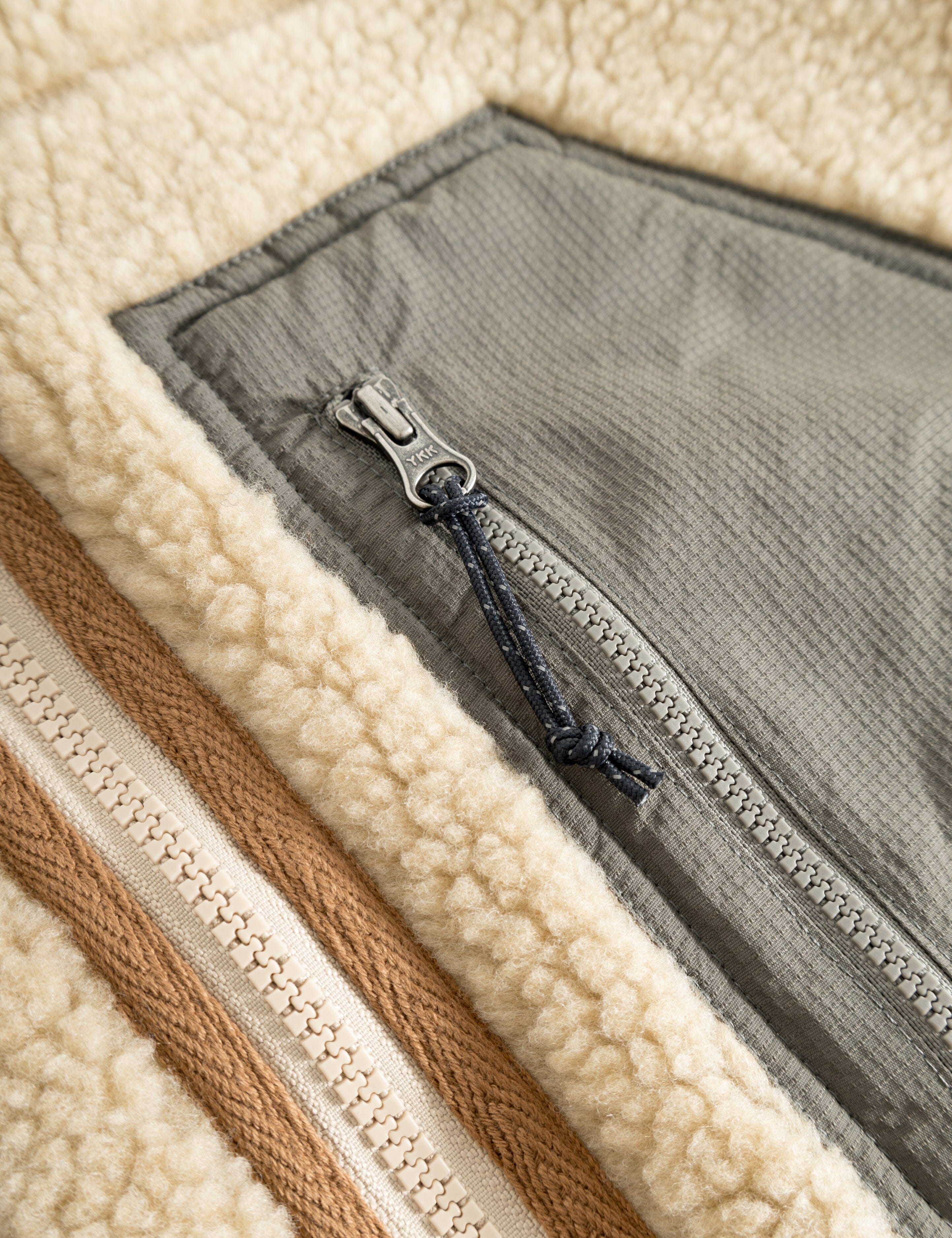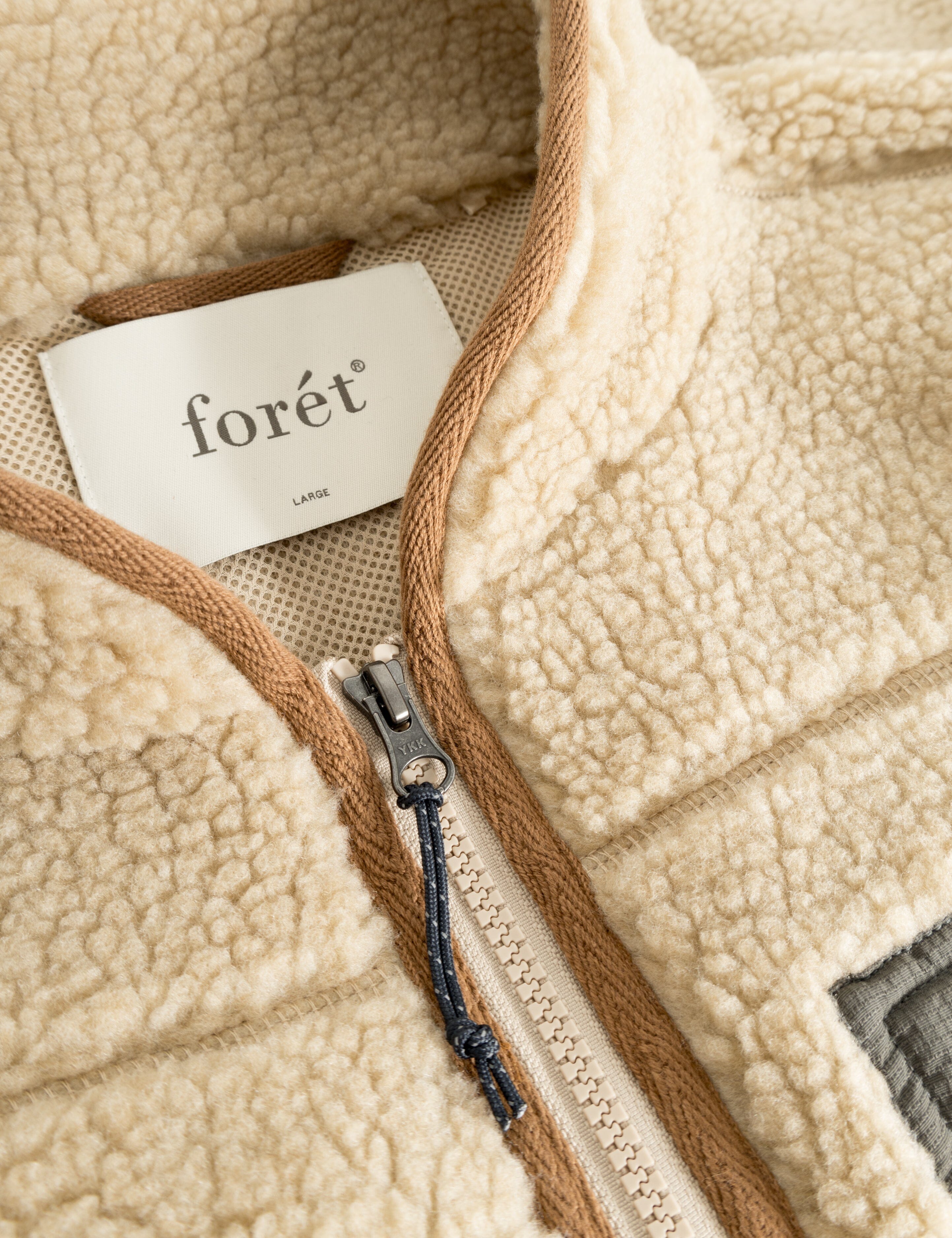 Forét sin Aurora Sherpa fleece-jakke er en must-have når det går mot kaldere dager. Den er laget med det klassiske sherpa-materialet som inneholder resirkulert polyester og akryl. Dette bidrar til å holde varmen, samt at den har en mer bærekraftig profil. Jakken kommer med to zippet lommer på brystet, samt to åpne lommer.