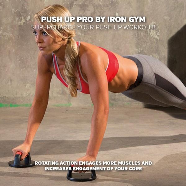 Push Up Pro - Roterende Push-up grep fra Iron Gym lar både armer og skuldre bevege seg naturlig. Musklene trenes mer målrettet og effektivt, samtidig som belastningen på håndledd og andre ledd reduseres. Styrker bryst, skuldre, armer, rygg og mage og mye mer. Push-up grep gir den ultimate overkroppstreningen, er lette å ha med seg overalt og kan brukes på alle gulvtyper – perfekt for hjemmet, kontoret eller på farten. Et must for alle som er seriøse med å komme i form.