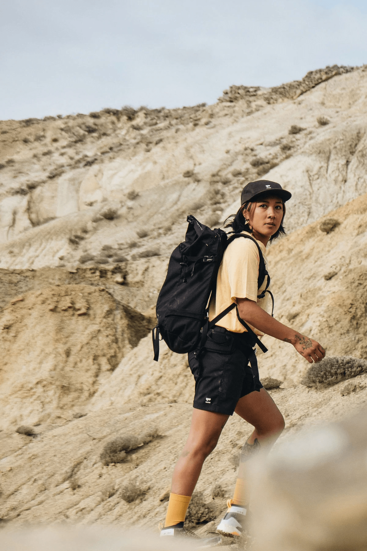 Laget i materiale fra resirkulerte plastflasker, kombinert med egenskapene til merinoull som er antibakterielt, temperaturregulerende og har god bevegelsesevne. Matchende belte følger med.