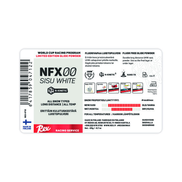 The new NFX series powders SISU White and SISU Black are based on the “diamond-hard” Rex UHW polymer wax mixture. The powder form allows for the application of this extremely wear-resistant wax mixture, known from Rex UHW liquid waxes, with a waxing iron, achieving the best possible durability. Use either as a base layer for other NFX powders or on its own. SISU Black contains the same completely new and first-time launched new snow additive mix as the NFX 21 G powder.