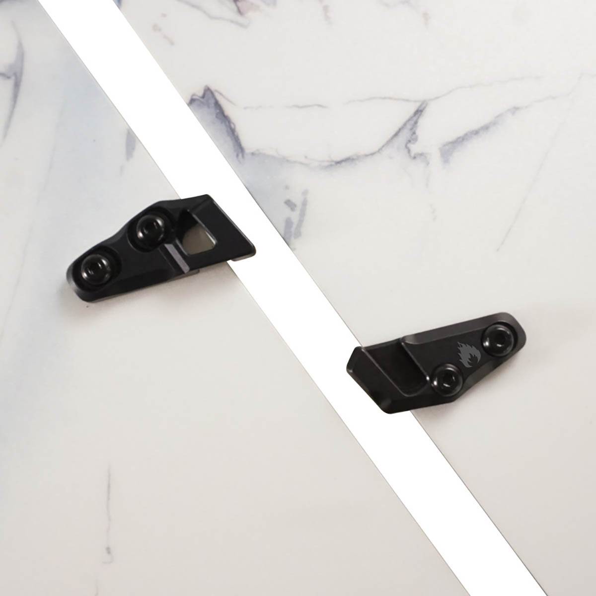 Hvis du ikke kan se skruehodene på brettets base, har splitboardet ditt top mount og er kompatibel med disse klipsene. Inkluderer to venstreklips, to høyreklips, (8) 10 mm grov-gjengede skruer, (8) fin-gjengede skruer, 4 skiver. Vekt: 56 g.