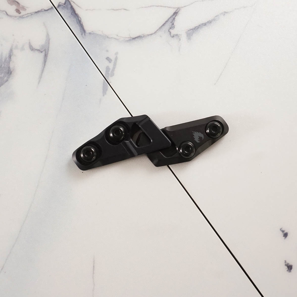Top mount splitboard-klips for splitboard med inserts på klipsenes monteringspunkter.