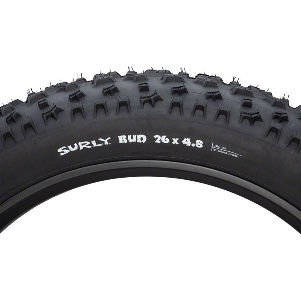 Surly Bud er 4.8"-dekk designet spesielt for bruk på 559mm (26 inch)-felger foran. Bud-dekket (og makkeren Lou) passer også på felger ned til 65mm bredde.