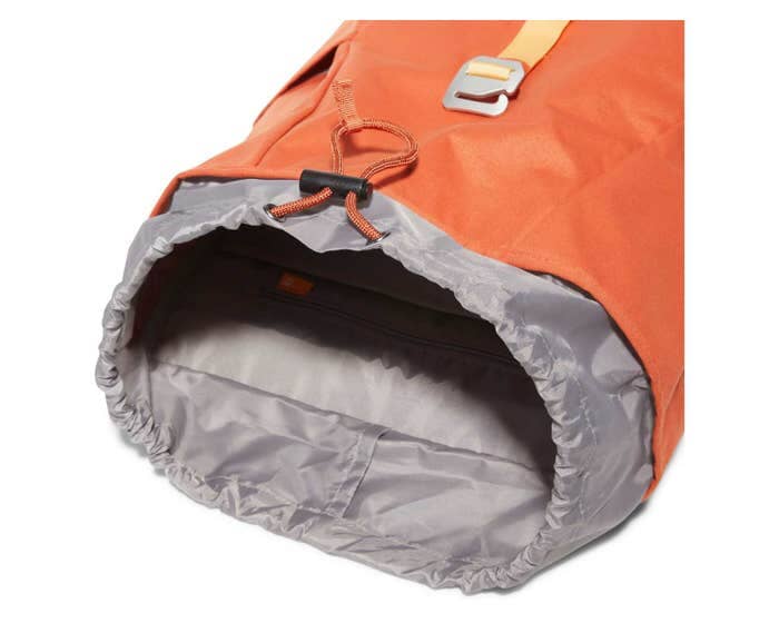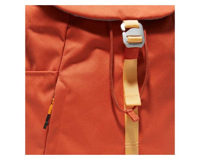Sekken er laget i 100% resirkulert polyester med detaljer i ekte skrinn. Hovedrommet lukkes med snøring, mens sekken klaff lukkes med metallspenne.