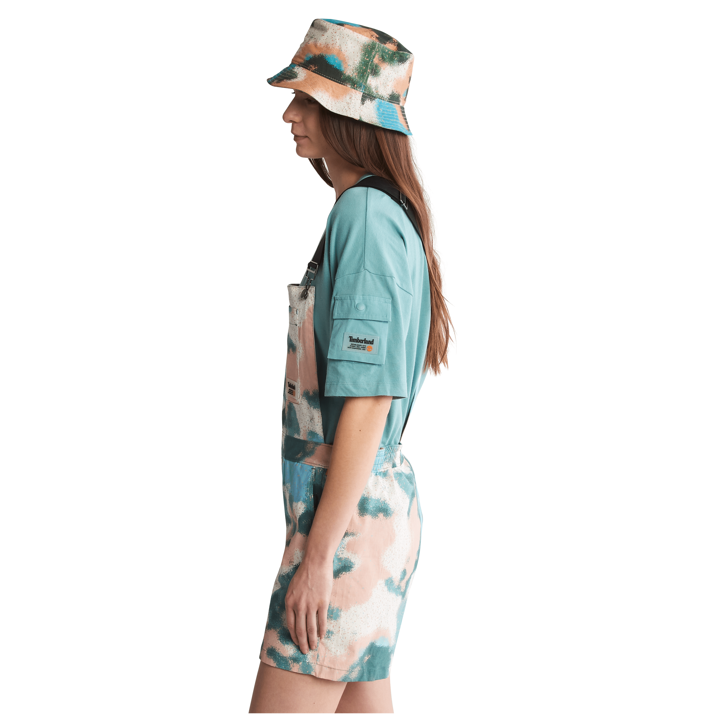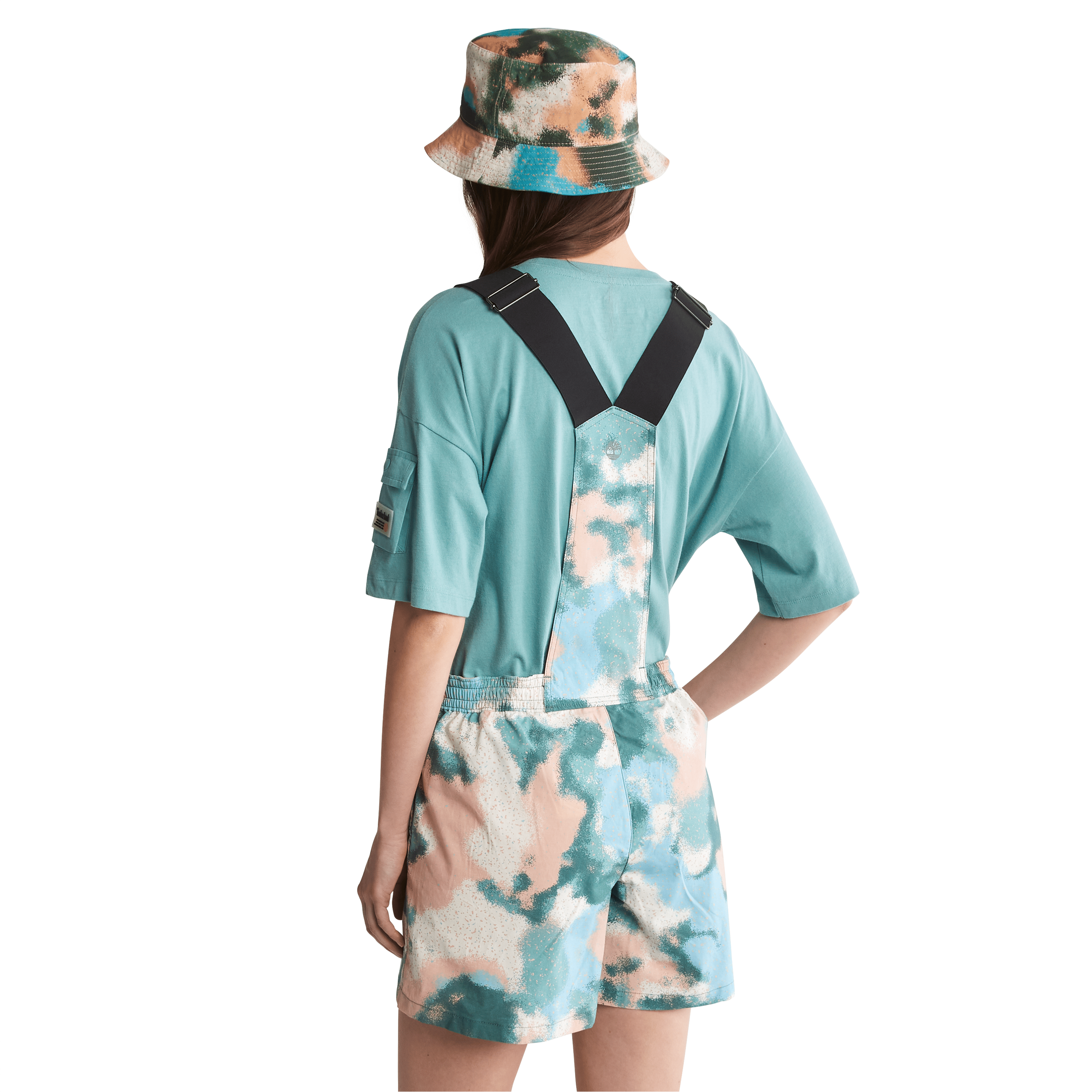 Sommershorts i overall/snekkerbukse-utgave. Brede seler som kan justeres og enkelt hektes av, stor lomme i front og elastisk liv.