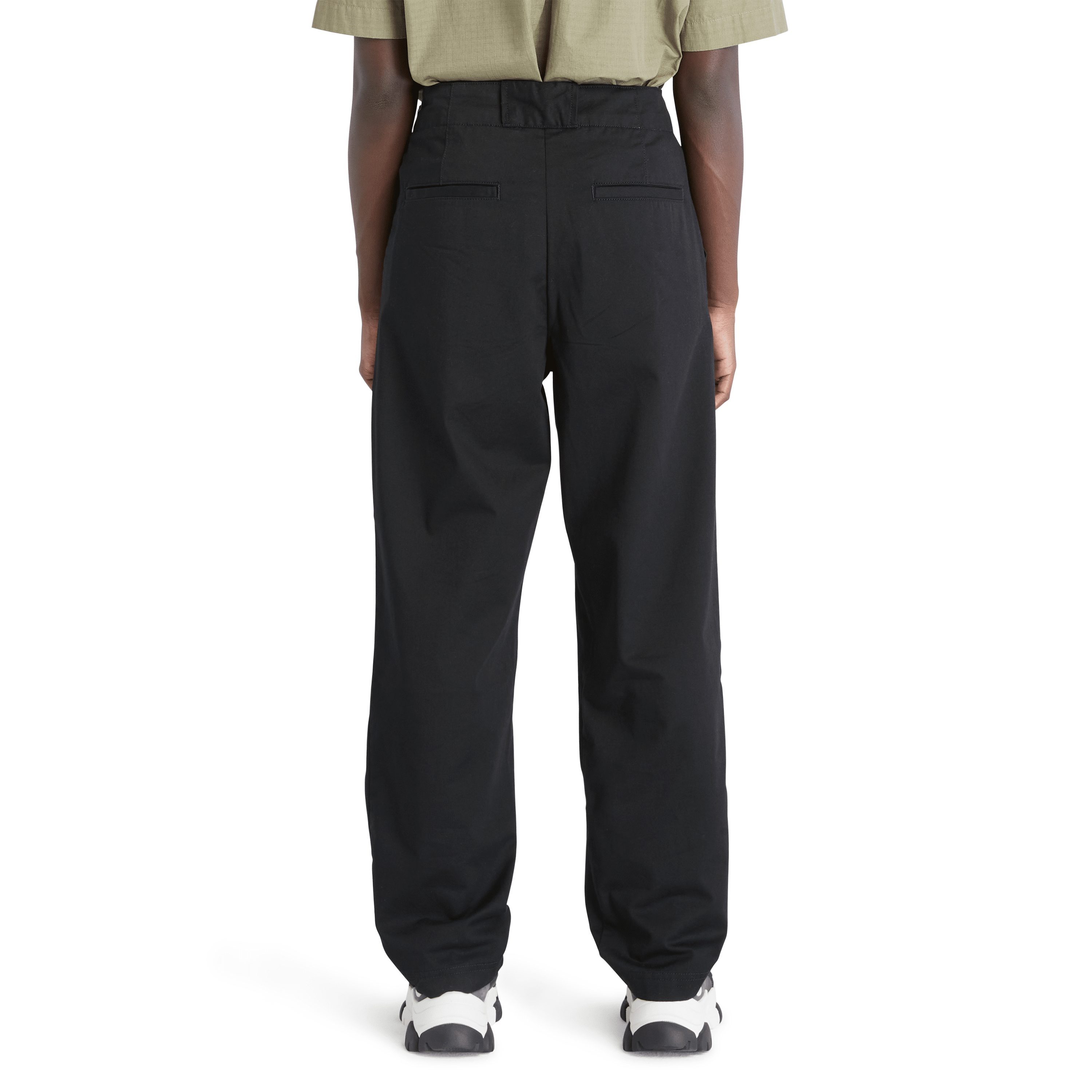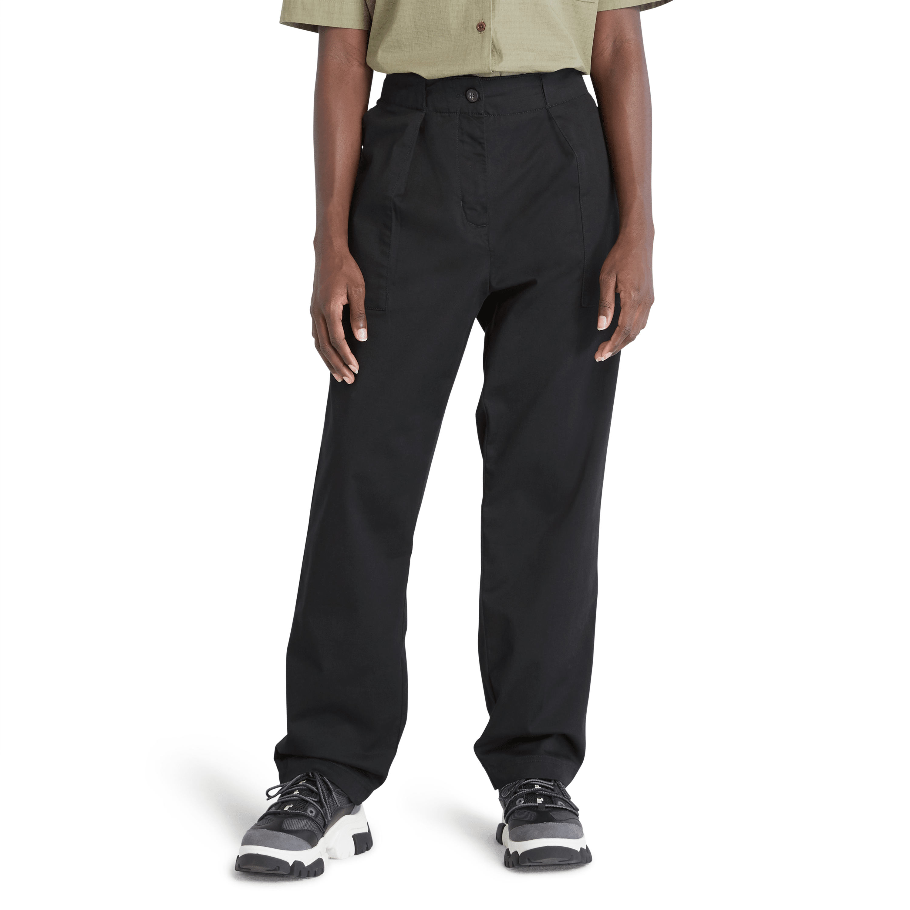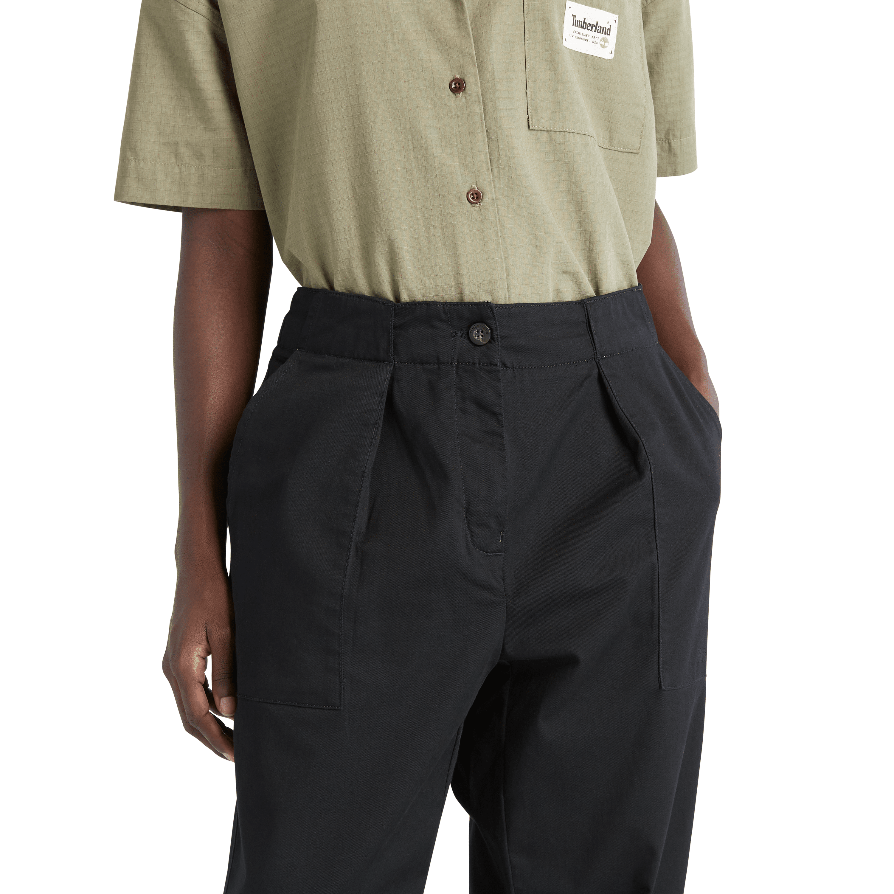 Buksa har Timberland sin workwear-inspirerte stil, med klassiske chinos-detaljer og folder i gront som gjør buksene litt finere enn vanlige damechinos.
