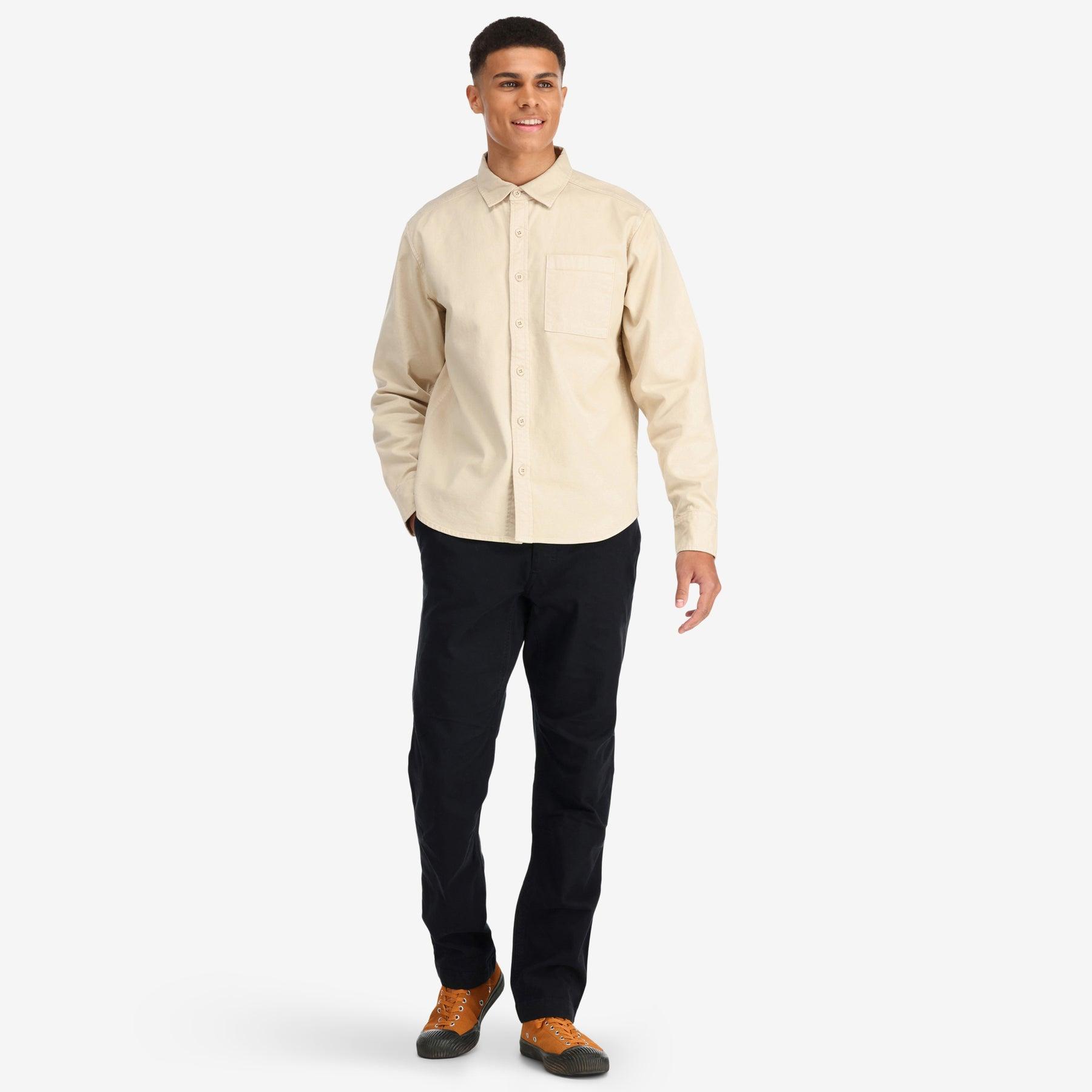 Topo Designs sin Dirt Shirt har rett passform, lett stretch og klassiske detaljer som lomme på brystet. Materialet kjennes komfortabelt ut fra første stund.