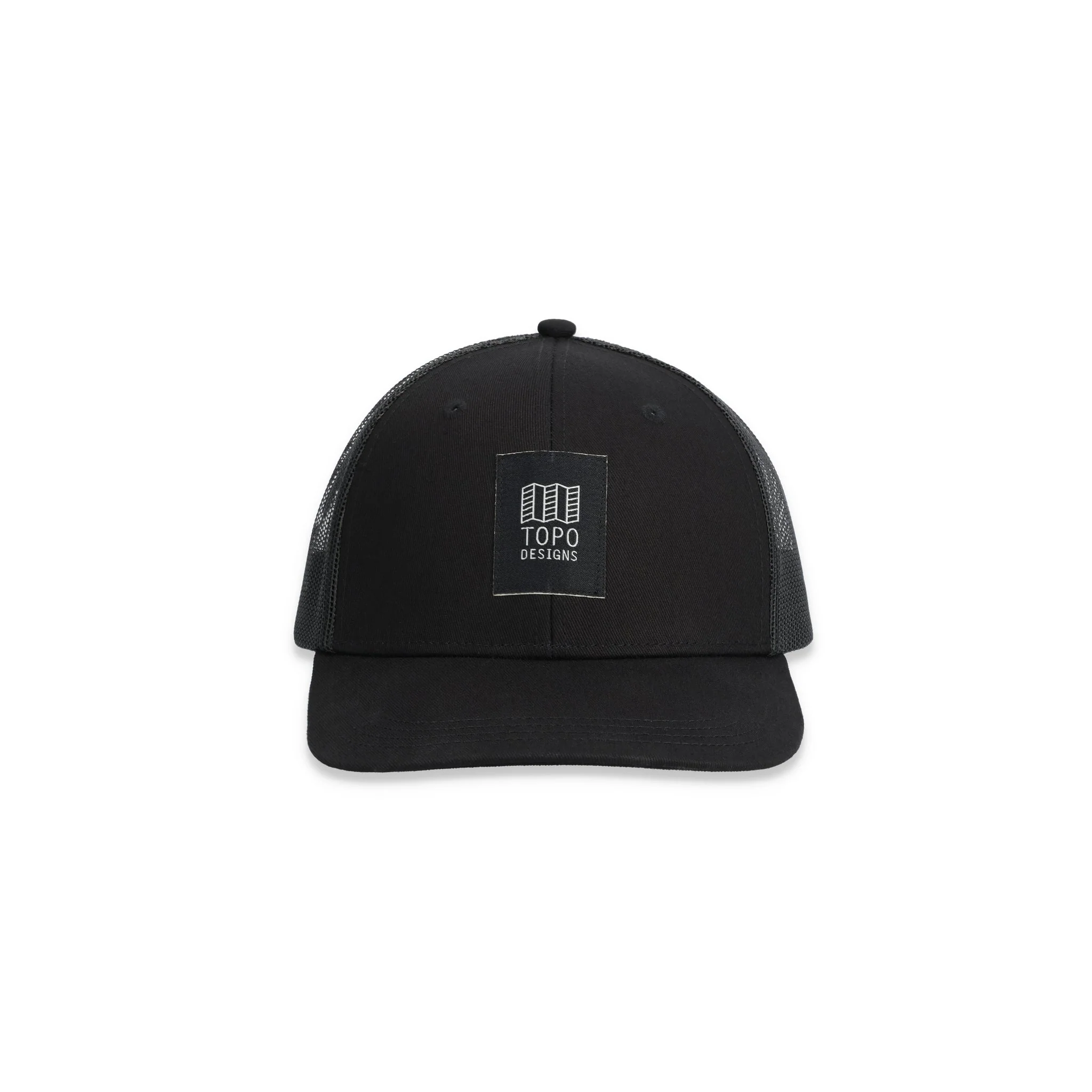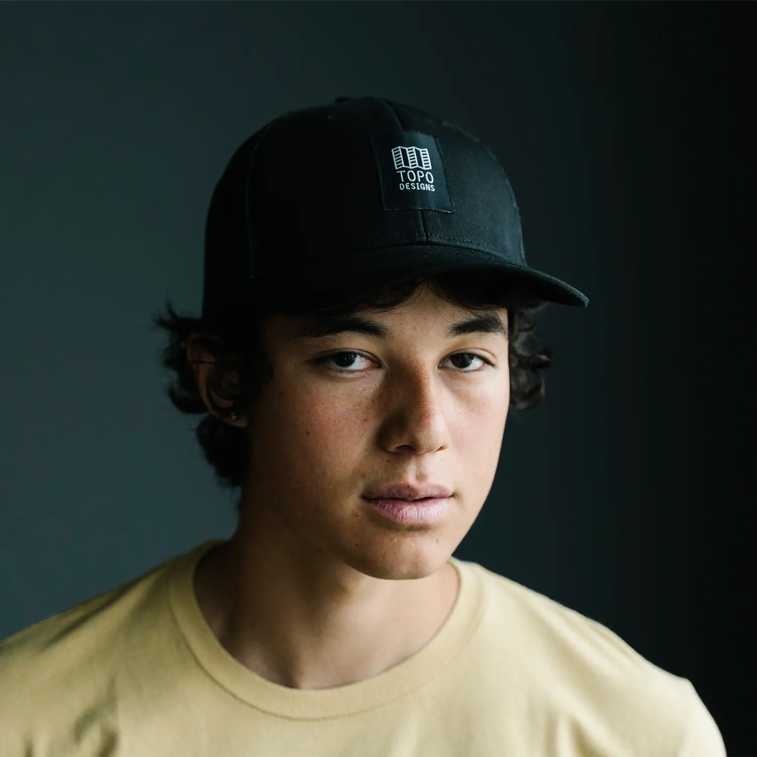 6-panel konstruksjon med mesh-panel og snapback for justering av passform. Topo Designs logo-patch i front.