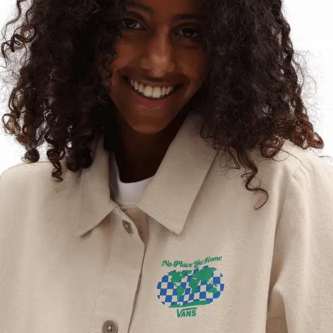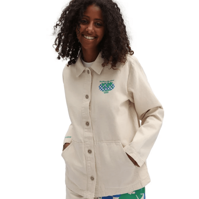 The Vans Eco Positivity Jacket is a workwear jacket with a front button closure, long sleeves, front pockets and the Vans logo on the left chest. It also features imagery on the back and sleeve.