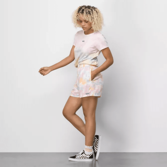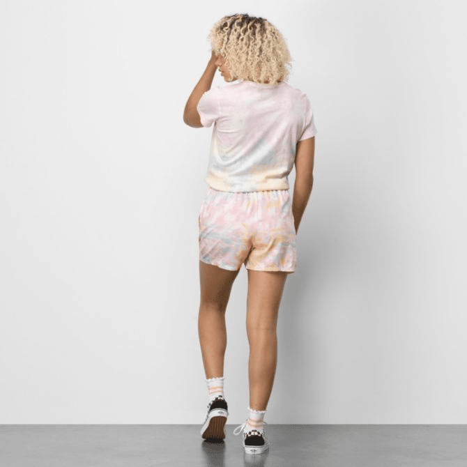Vans Mascy Daze Tri Dye Woven shorts til dame, er en perfekt lett og ledig sommershorts i 100% viskose og med allover print. Høyt liv med elastisk linning, sidelommer og løs passform.